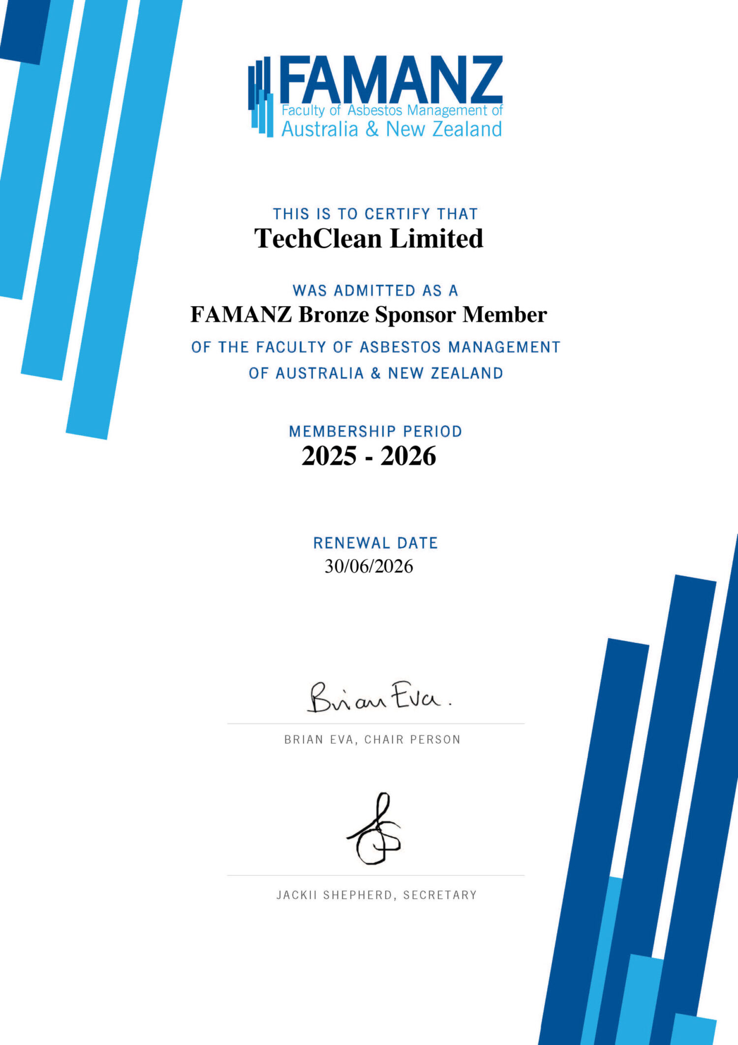 At TechClean we pride ourselves on adhering to the highest standards of industry compliance and safety. Our team is backed by a wide range of professional certifications and accreditations, ensuring our expertise in asbestos removal, HAZMAT decontamination, bio cleaning, and more. These qualifications demonstrate our commitment to delivering safe, effective, and environmentally conscious services across New Zealand.